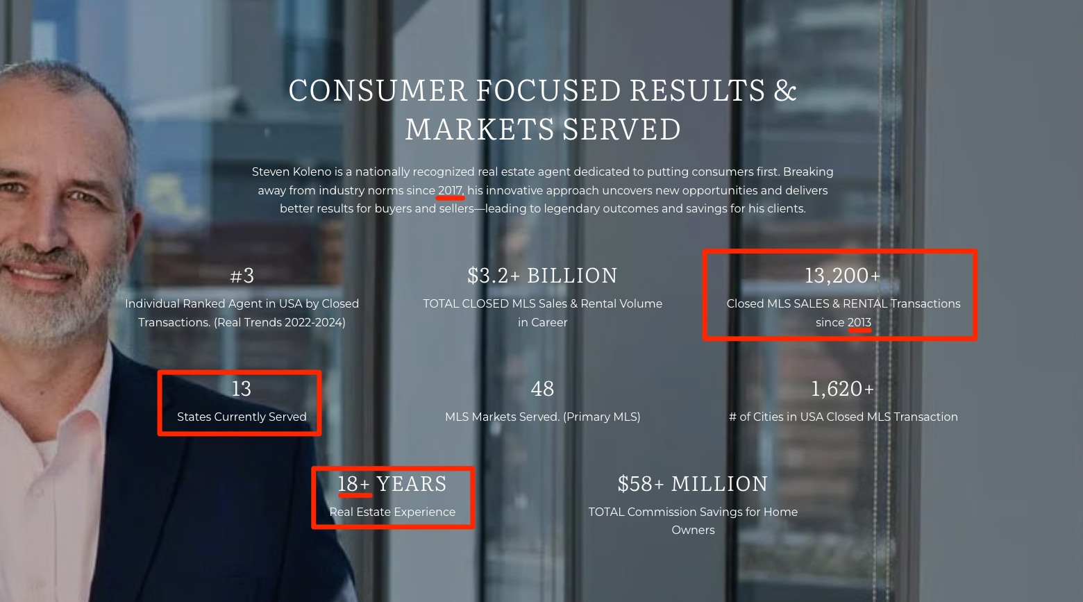 His big headline claim is "Consumer Focused Results" and he claims 18+ years of real estate experience. But he's been breaking away from industry norms since 2017?