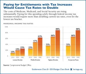 Add to that dismal news the undeniable fact that as the Boomers retire, the nation is going to have to confront some serious issues with entitlement spending. Robert Samuelson is being cute when he writes "As baby boomers retire, higher federal spending on Social Security, Medicare and Medicaid may boost Millennials' taxes and squeeze other government programs." There ain't no "may" about it; it's gonna happen, barring some miraculous unforeseeable event. The Heritage Foundation estimates that tax rates would double by 2050 under current law, even for the lowest level. Here's a handy graphic: