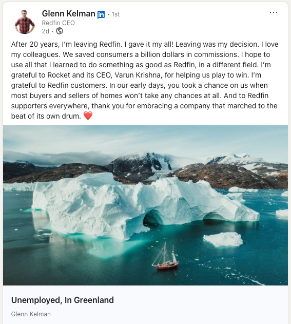 A couple of days ago, as I write this, Glenn Kelman, CEO of Redfin, announced his retirement via social media: