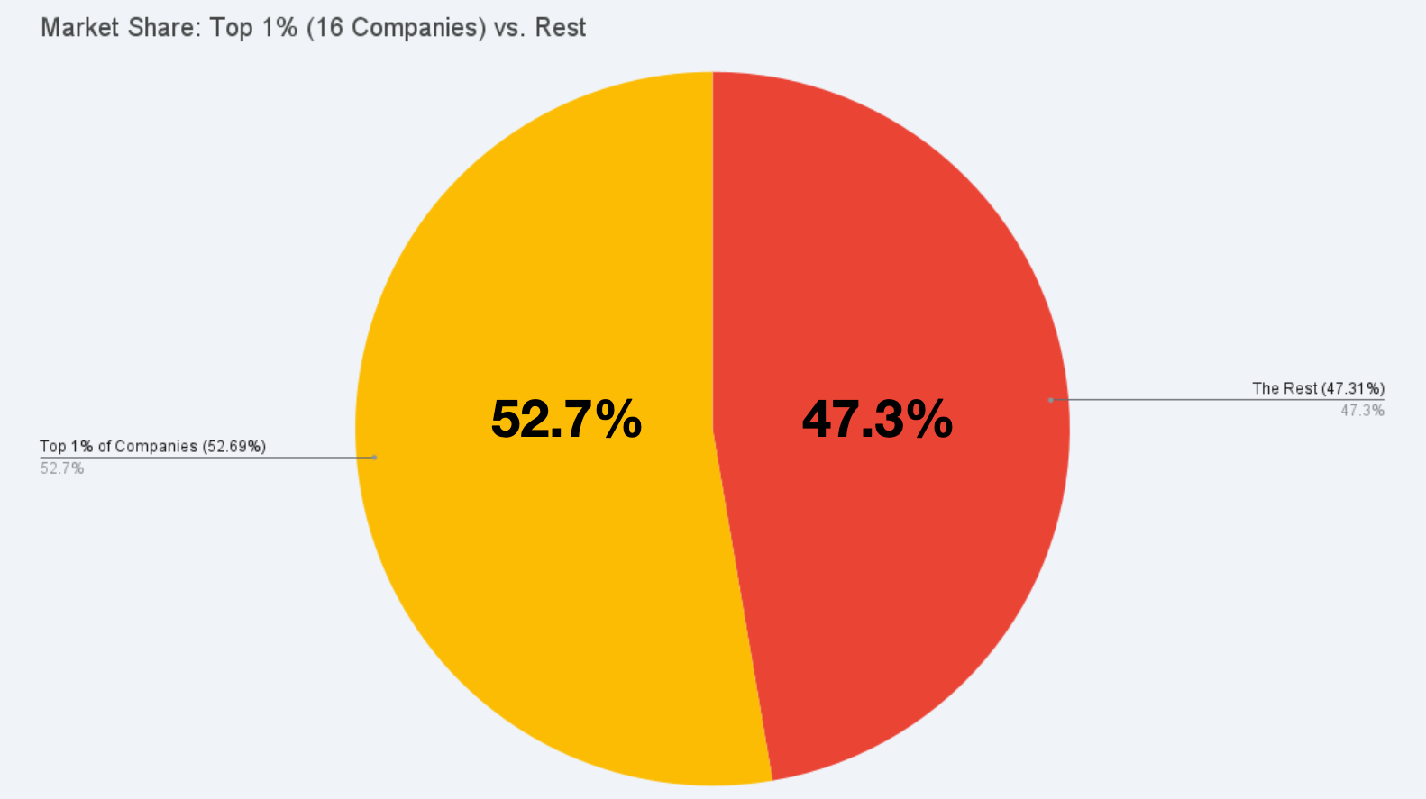 This is the market share of a large MLS with roughly 1,600 participant brokerages. The top 16 brokerage companies in that MLS controls 53% of transactions, and about the same in listings. If you move to the top 5%, or 80 companies, we're looking at 80% of the transactions in that MLS.