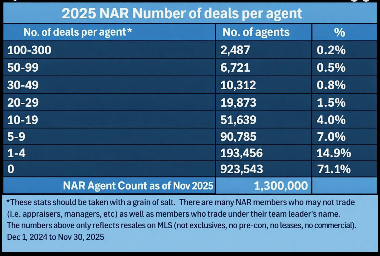 The agents doing 10+ deals are 7% of the REALTOR population; they do 70% of all transactions. 14% of agents do 5+ deals and they are responsible for 87% of all transactions.